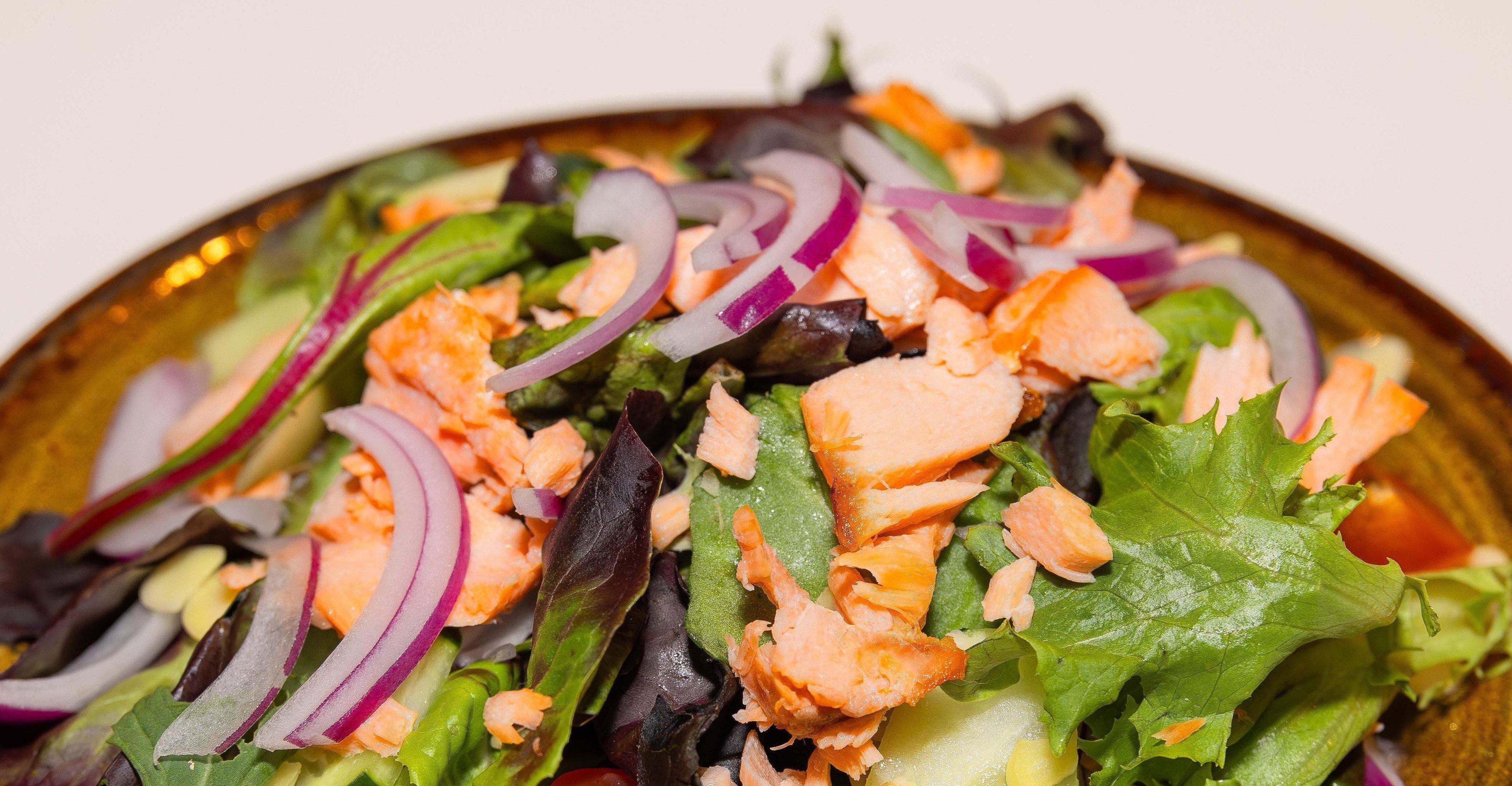Columbia river salmon, mixed greens, red onion, cucumber, slivered almonds, huckleberry vinaigrette